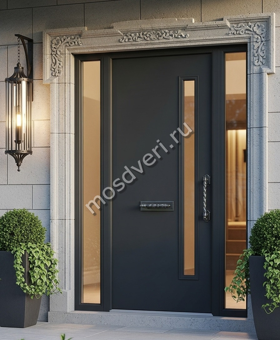 Большая входная дверь в частный дом серая — совмещает эстетичность и максимальную защиту.