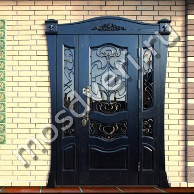 Парадная дверь в дом из массив дуба со стеклопакетом, ковкой и резьбой по дереву